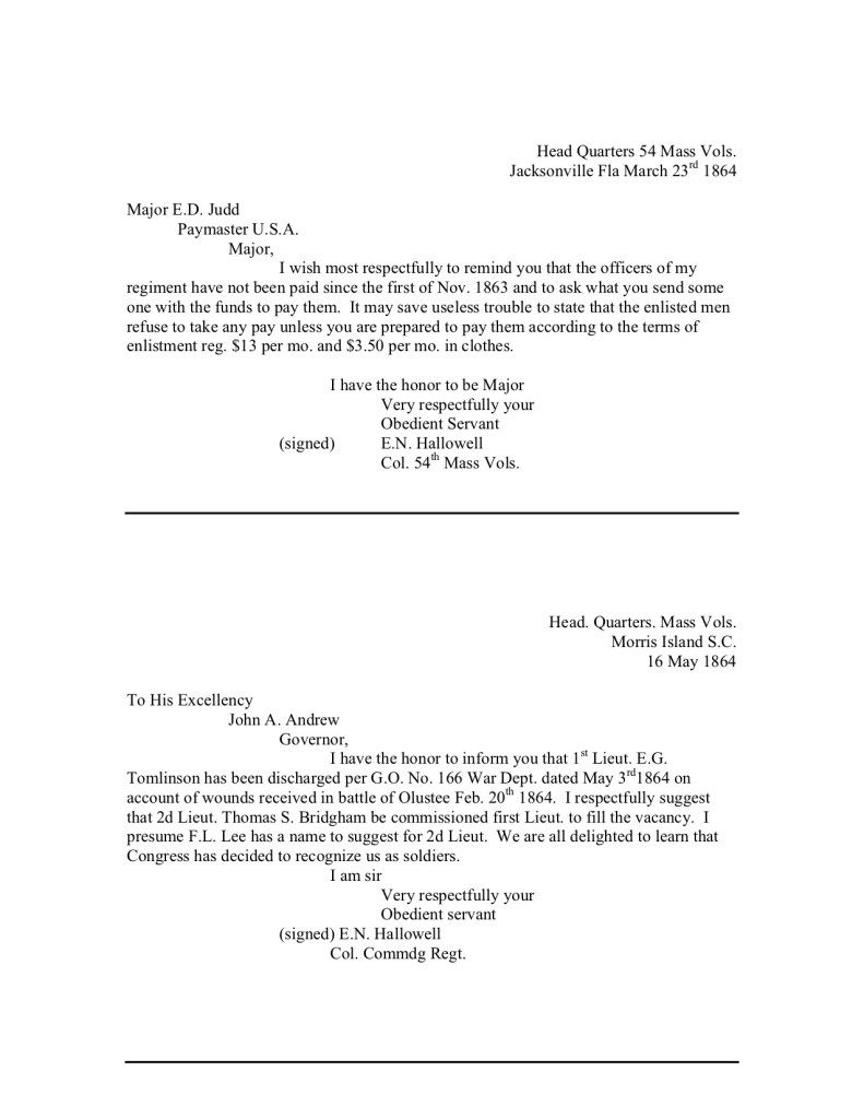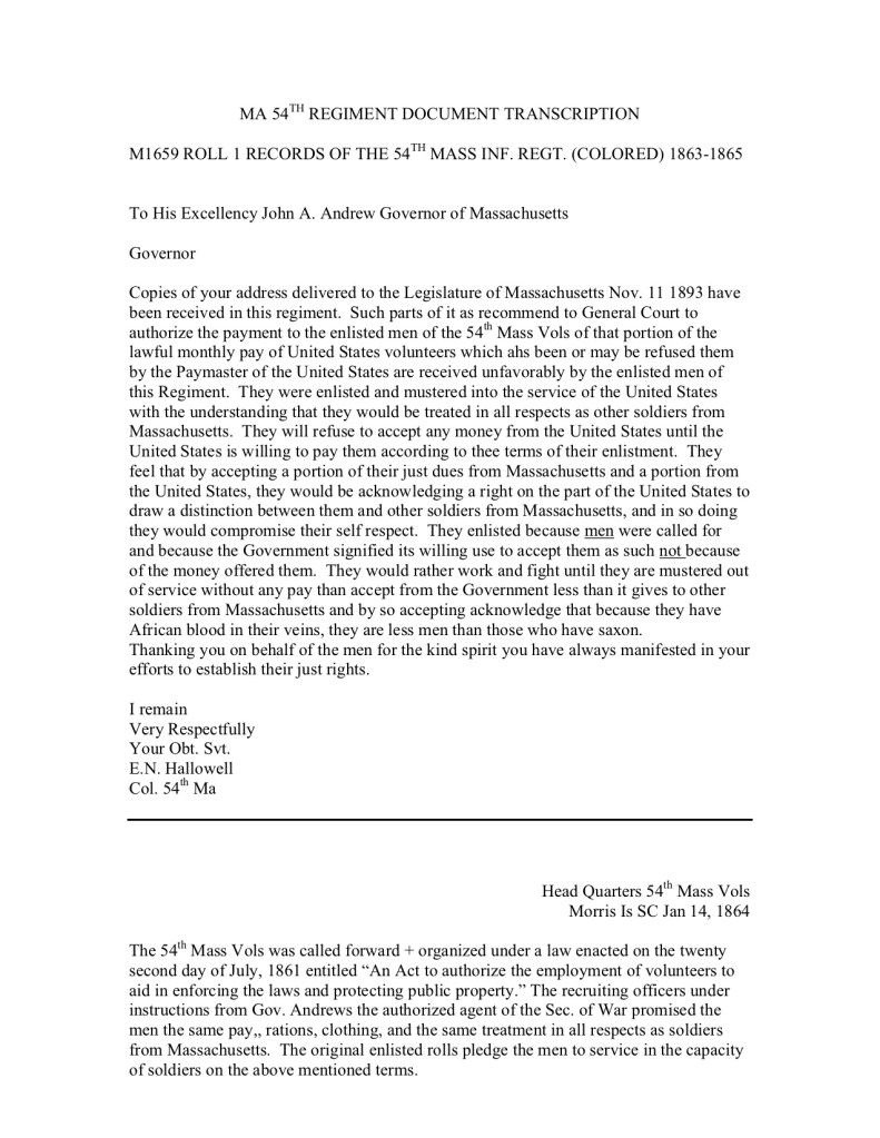 Copies of your address delivered to the Legislature of Massachusetts Nov. 11 1893 have been received in this regiment. Such parts of it as recommend to General Court to authorize the payment to the enlisted men of the 54th Mass Vols of that portion of the lawful monthly pay of United States volunteers which ahs been or may be refused them by the Paymaster of the United States are received unfavorably by the enlisted men of this Regiment. They were enlisted and mustered into the service of the United States with the understanding that they would be treated in all respects as other soldiers from Massachusetts. They will refuse to accept any money from the United States until the United States is willing to pay them according to thee terms of their enlistment. They feel that by accepting a portion of their just dues from Massachusetts and a portion from the United States, they would be acknowledging a right on the part of the United States to draw a distinction between them and other soldiers from Massachusetts, and in so doing they would compromise their self respect. They enlisted because men were called for and because the Government signified its willing use to accept them as such not because of the money offered them. They would rather work and fight until they are mustered out of service without any pay than accept from the Government less than it gives to other soldiers from Massachusetts and by so accepting acknowledge that because they have African blood in their veins, they are less men than those who have saxon.