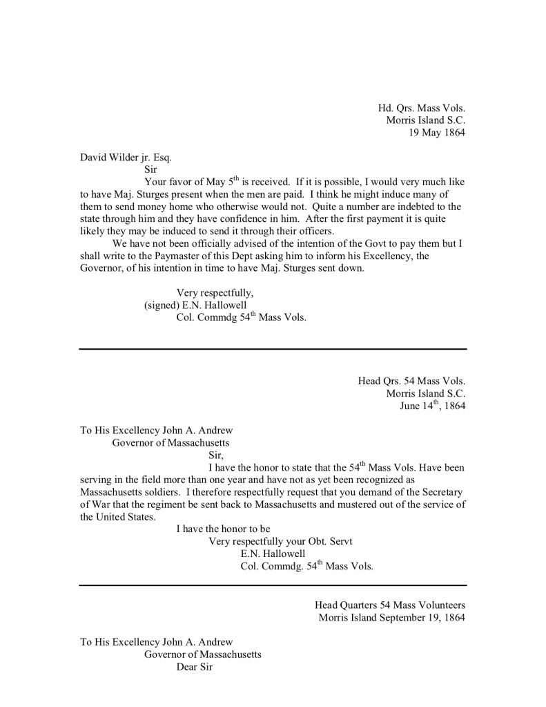 This document includes transcripts of letters from various members of the MA 54th protesting their unequal pay and demanding that they receive thesame treatment as all other Massachusetts volunteers.