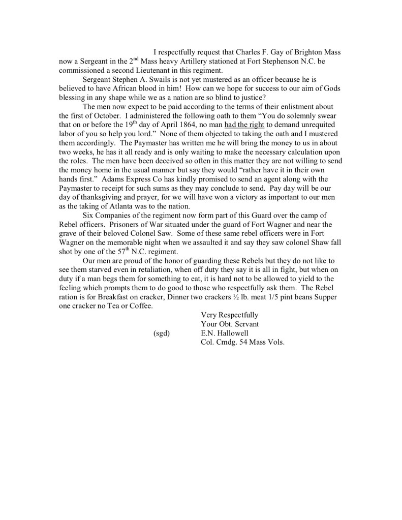 I respectfully request that Charles F. Gay of Brighton Mass now a Sergeant in the 2nd Mass heavy Artillery stationed at Fort Stephenson N.C. be commissioned a second Lieutenant in this regiment.