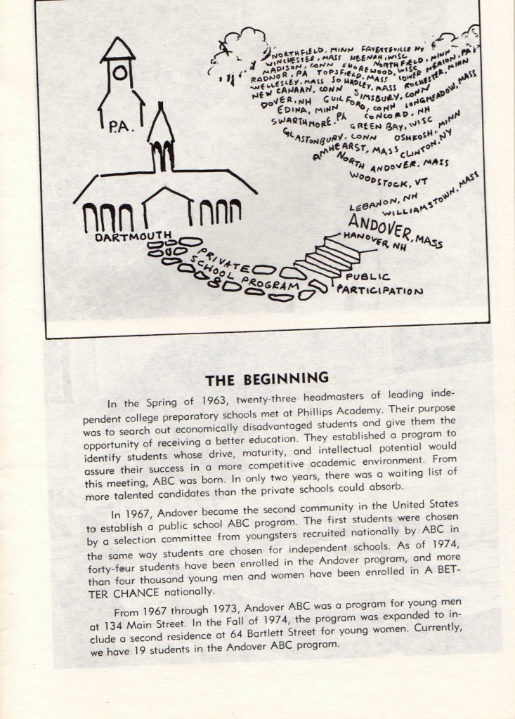 In 1967, Andover became the second community in the United States to establish a public school ABC program. The first students were chosen by a selection committee from youngsters recruited nationally by ABC in the same way students are chosen for independent schools. As of 1974, forty-four students have been enrolled in the Andover program, and more than four thousand young men and women have been enrolled in A BETTER CHANCE nationally.