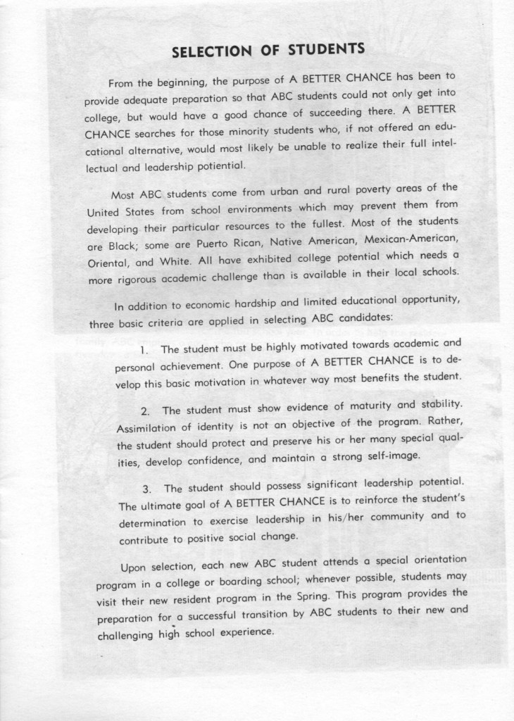 From the beginning, the purpose of A BETTER CHANCE has been to provide adequate preparation so that ABC students could not only get into college, but would have a good chance of succeeding there. A BETTER CHANCE searches for those minority students who, if not offered an educational alternative, would most likely be unable to realize their full intellectual and leadership potential.