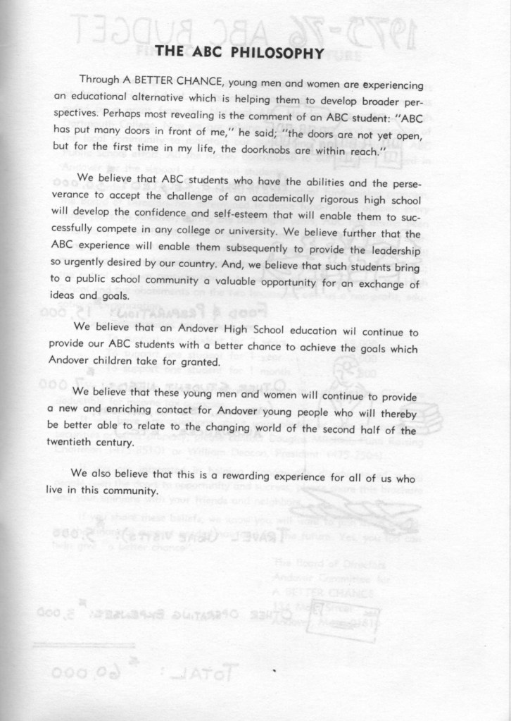 We believe that an Andover High School education [will] continue to provide our ABC students with a better chance to achieve the goals which Andover children take for granted.