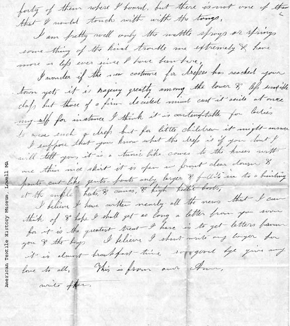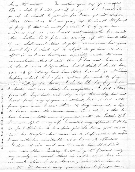 Ann, the writer. To mother, you say, you would like a dress & I will get it for you, but I want to go up to Lowell & get it. For I can get it cheaper there than here, (&) I am going up to Lowell (on) the fourth of July & that is not far distant. If you can wait as well as not—I will not send the box, until then brothers, B & John, are coming up to Lowell then & we shall meet there together as we were last year . But I hope I will not be obliged7 to go home so soon after it as I was last year. Especially under the same circumstances that I did then. I have not been up to Lowell since I left there, but I think I should have gone up if Nancy had been there, but she is at Quincy keeping school & has five dollars per week & pays nine shillings for board8. I should like her pay, but I should not care about her occupation. I had a letter from the boys last week, they wrote that they had not heard from any of you, or at least had not had a letter from you since I saw them & they were at a loss to know what the reason was. Pa wrote me that he had become a little more acquainted with the Eatons’ & I have no objection my‐self, he wanted my approval and he has it for I think her to be a fine girl. She has a good education, has taught school some, is a dress maker &c **** I was with her considerable while I was at Newton. It does not rain much now & I will leave off & finish some other time Tuesday, & it is quite pleasant only very windy as usual there is more wind here in one week than I ever knew any where else in a month. It seemed very queer when I first came