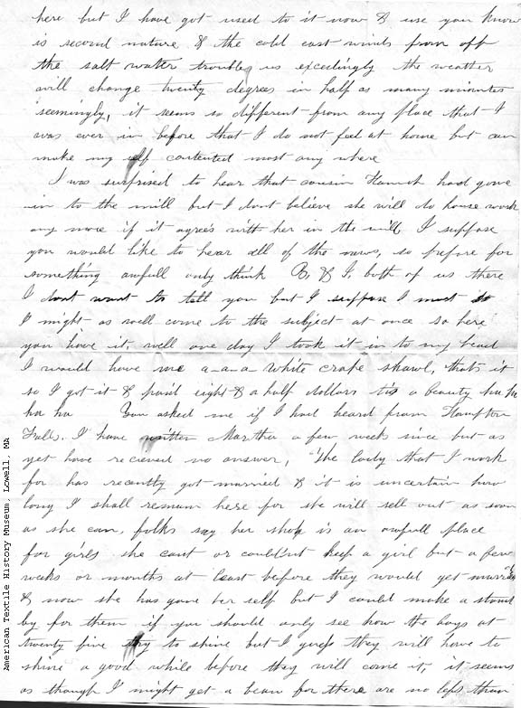 I was surprised to hear that Cousin Hannah had gave (sic) in to the mill but I don’t believe she will do house work any more, if it agrees with her in the mill. I suppose you would like to hear all the news, so prepare for something awfull only think B & J both of us there. I don’t want to tell you, but I suppose I must & I might as well come to the subject at once so here you will have it. Well one day I took it into my head I would have me a‐a‐a white crape9 shawl, that’s it. So I got it and paid eight & a half dollars. Tis a beauty. Ha ha ha ha You asked me if I had heard from Hampton Falls. I have written Martha a few weeks since, but as yet have received no answer. The lady that I work for has recently got married & it is uncertain how long I shall remain here for she will sell out as soon as she can. Folks say her shop is an awfull place for girls. She can’t or couldn’t keep a girl, but a few weeks or months at least before they would get married & now she has gone for herself, but I could make a stand by for them. If you could only see how the boys at twenty‐five try to shine, but I guess (***?) they will have to shine a good while before they will come (to) it. It seems as though I might get a beau10 for there are no less than