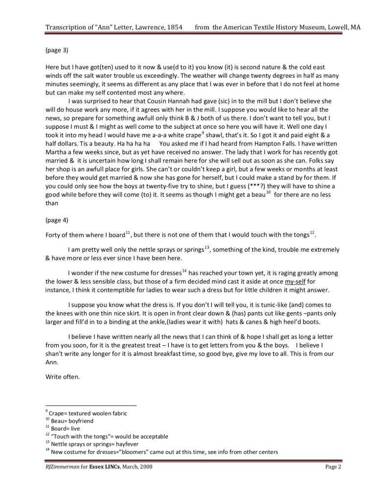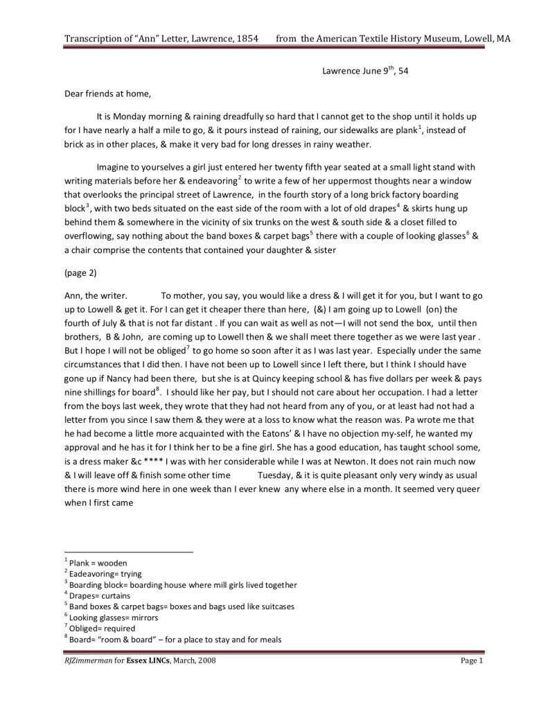 **Note: This is a low image resolution of only the 1st page, the original document can be found at the American Textile History Museum in Lowell, Massachusetts, however the complete transcription is included here.