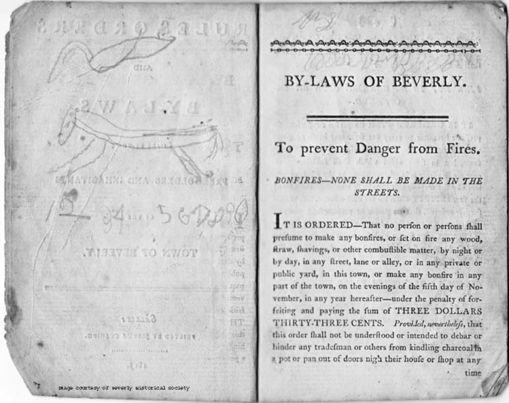 IT IS ORDERED – That no person or persons shall presume to make any bonfires, or set on fire any wood, straw, shavings, or other combustible matter, by night or by day, in any street, lane or alley, or in any private or public yard, in this town, or make any bonfire in any part of the town, on the evenings of the fifth day of November, in any year hereafter – under the penalty of forfeiting and paying the sum of THREE DOLLARS THIRTY-THREE CENTS. Provided, nevertheless, that this order shall be understood or intended to debar or hinder any tradesman or others from kindling charcoal in a pot or pan out of doors nigh their house or shop at any time
