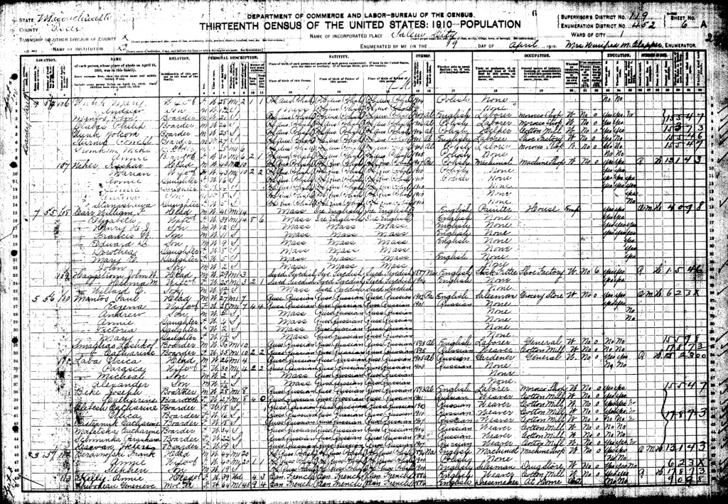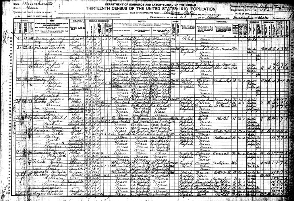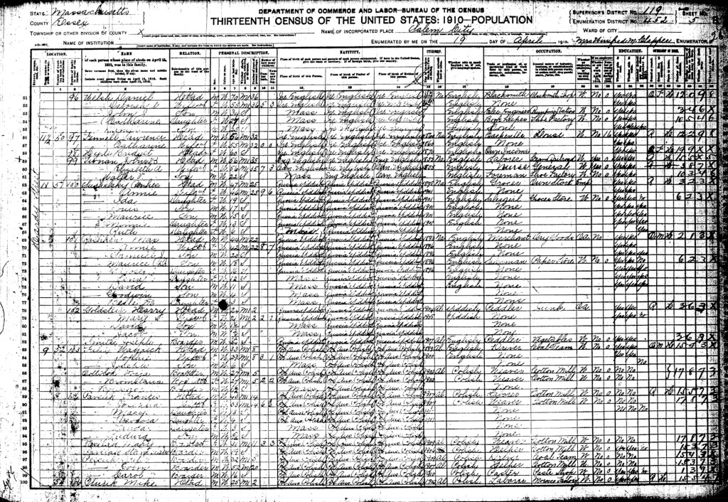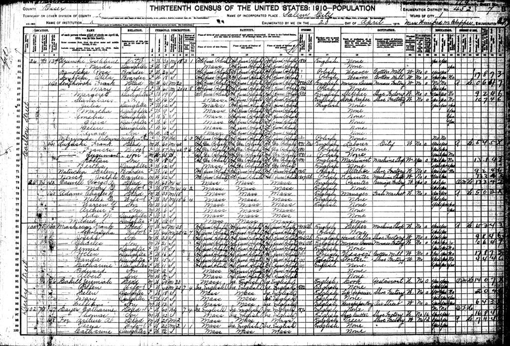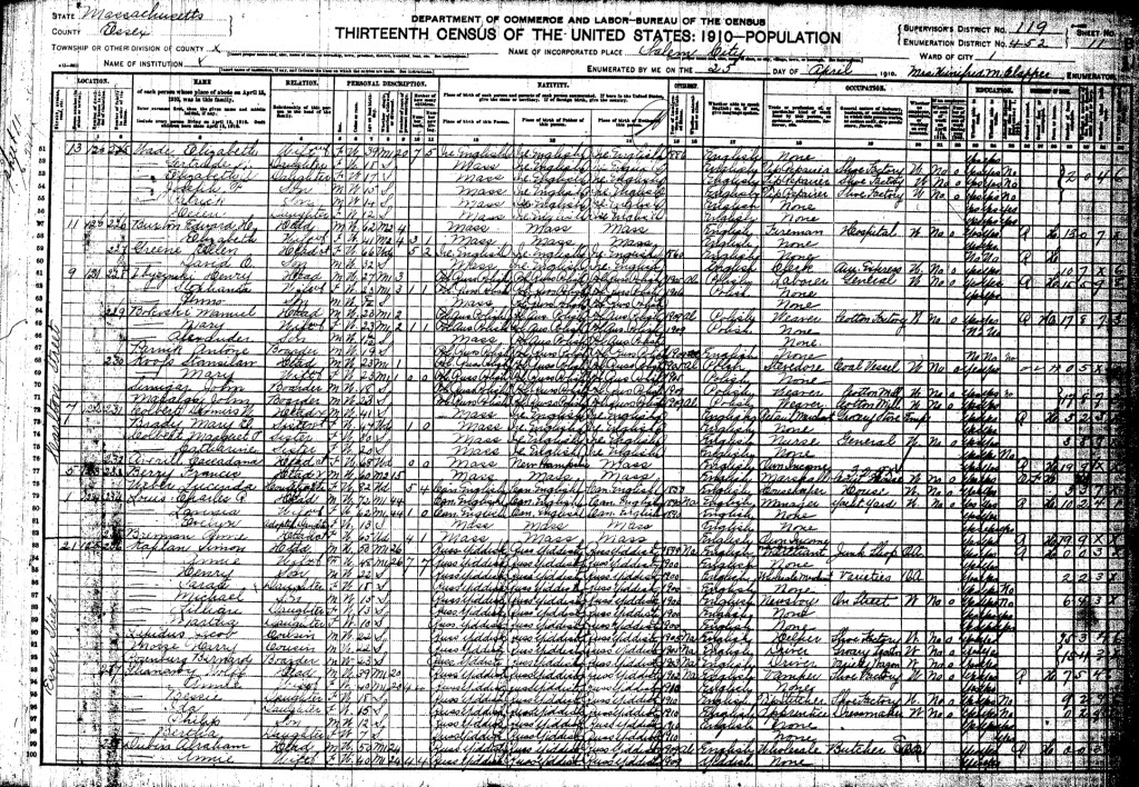 U.S. Department of Commerce and Labor. Bureau of the Census. Twelfth Census of the United States, 1910, Population. Salem, MA (selections from Ward 1). National Archives, Northeast Branch, Waltham, MA.
