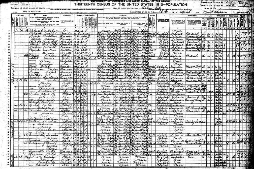 Track the changing populations of Salem in the early twentieth century with census documents. Most people appearing on these pages are recorded as Polish and Irish, but a few are described as Greek, Swedish and Can. French. Notice that those born in Poland are distinguished between “Russ Polish” (Russia) and “Aust Polish” (Austria Hungary). Pay attention also to the years of immigration, most of which are recorded in the decades preceding the census. Click here for selections from the 1900 census in Salem.