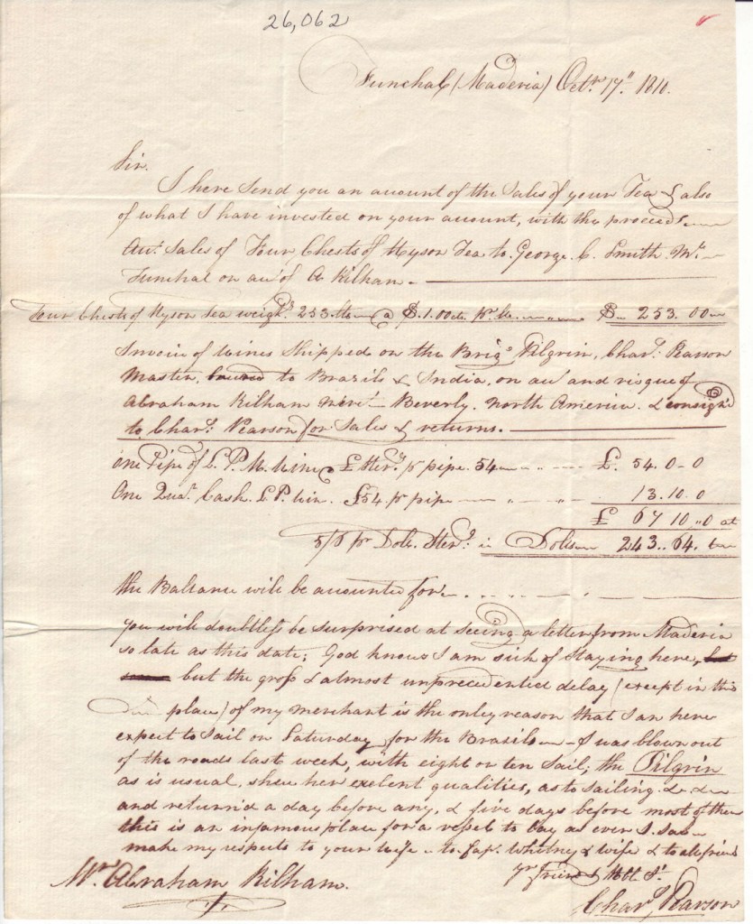 Master, bound to Brazils & India, on [?] and risqué of Abraham Kilham [?] Beverly, North America & cosigned to Char[les] Pearson for Sales & returns.