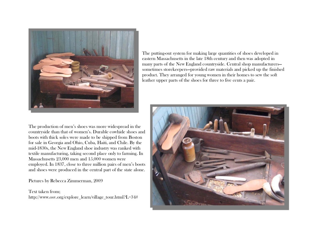 “Shoes were usually completed in small shops, where each worker sat at a bench with his hammer, last, awls, pegs, string, wax, and bristles close at hand.