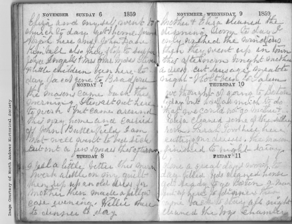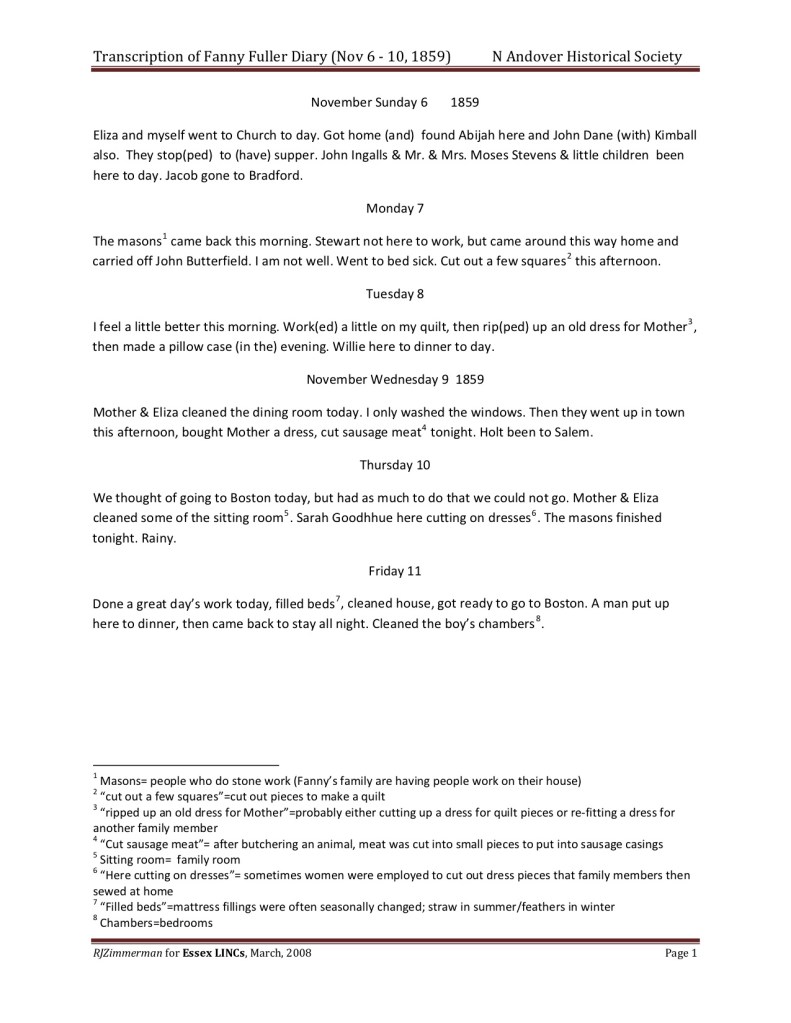 Fanny Fuller Diary (November 6-10, 1859). North Andover Historical Society, North Andover MA.