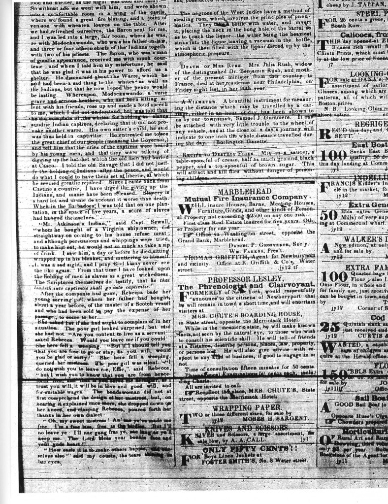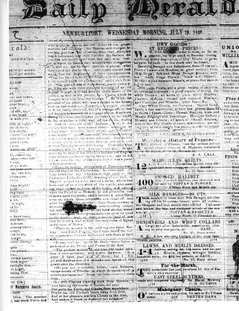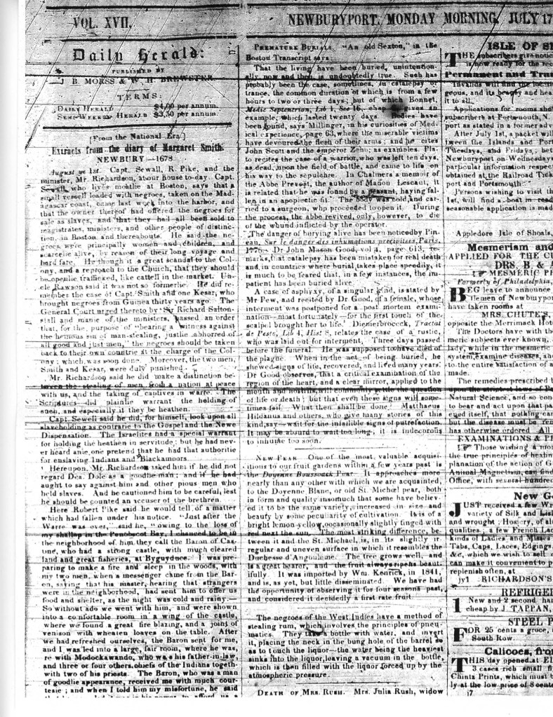 Margaret Smith wrote her diary in 1678. Extracts of the diary appeared in Newburyport’s Daily Herald on July 17-18, 1848. In the excerpted entry, Smith talks about the importation and sale of a boatload of slaves in Boston. This sale prompted some debate among Boston society about the morality of holding Native American and African slaves. It is interesting that this portion of the diary was reprinted in 1848, likely motivated by the abolitionist movement.