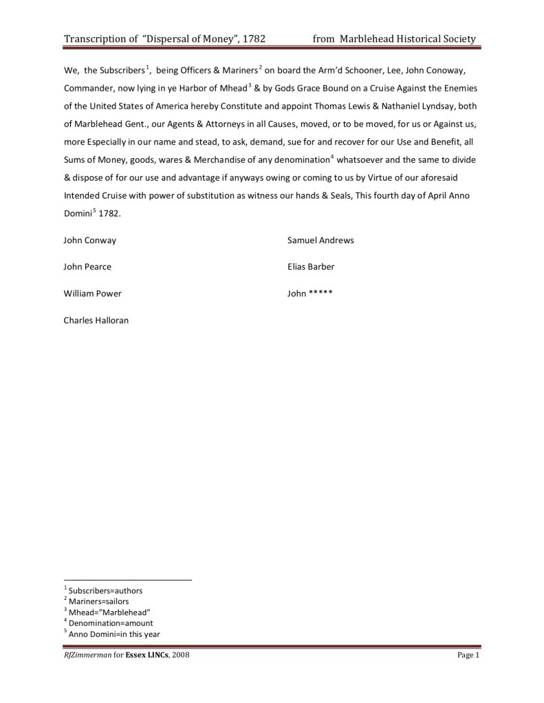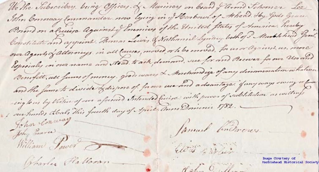 We, the Subscribers1, being Officers & Mariners2 on board the Arm’d Schooner, Lee, John Conoway, Commander, now lying in ye Harbor of Mhead3 & by Gods Grace Bound on a Cruise Against the Enemies of the United States of America hereby Constitute and appoint Thomas Lewis & Nathaniel Lyndsay, both of Marblehead Gent., our Agents & Attorneys in all Causes, moved, or to be moved, for us or Against us, more Especially in our name and stead, to ask, demand, sue for and recover for our Use and Benefit, all Sums of Money, goods, wares & Merchandise of any denomination4 whatsoever and the same to divide & dispose of for our use and advantage if anyways owing or coming to us by Virtue of our aforesaid Intended Cruise with power of substitution as witness our hands & Seals, This fourth day of April Anno Domini5 1782.