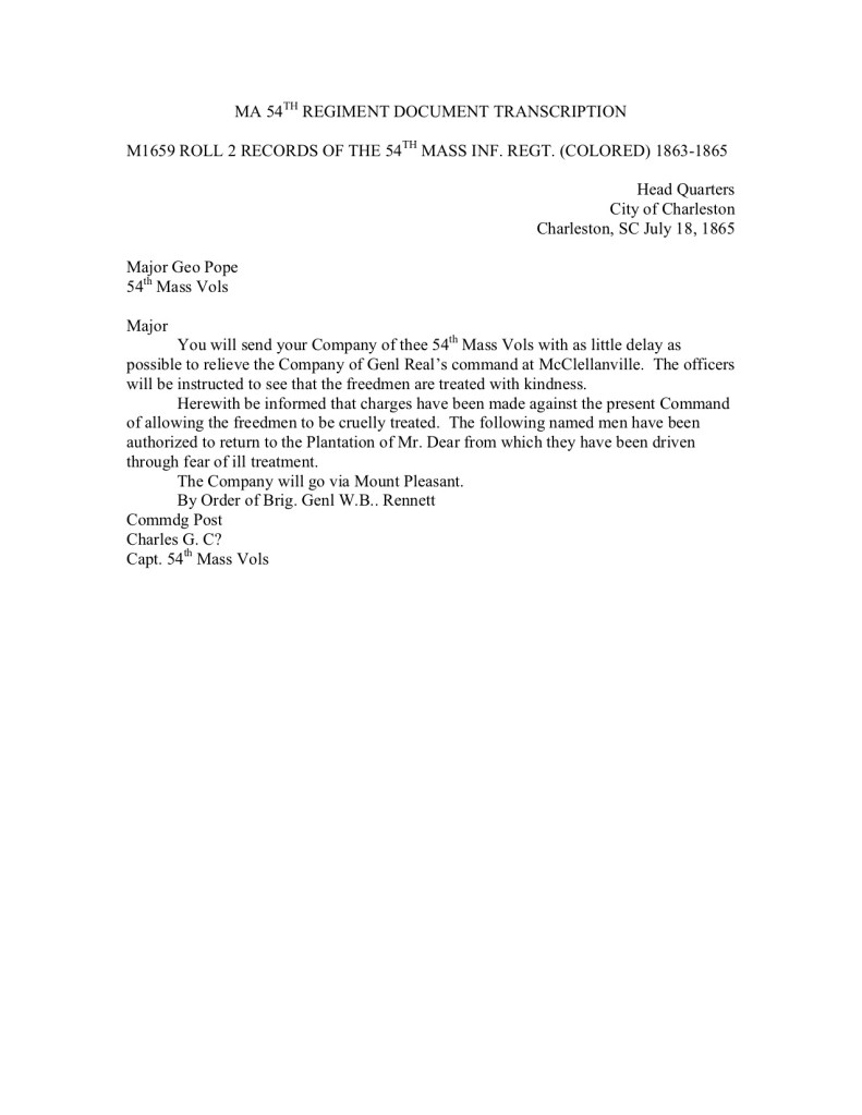 Charles G.C., Charles G.C. to Major Geo Pope (July 18, 1865). M1659 Roll 2, Records of the 54th Mass Inf. Regt. (Colored) 1863-1865. Massachusetts Historical Society, Boston, MA.