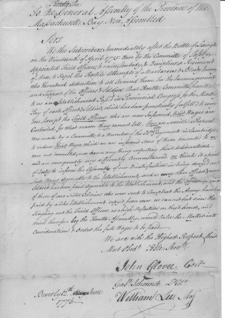 We the Subscribers, Immediately after the Battle of Lexington on the Nineteenth of April 1775 were by the Committee of Safety, appointed Field Officers to rain, Embody & discipline, a Regiment of Men, to Repel the Hostile Attempts of a Barbarous & Bloody Enemy who threatened destruction to all around them, for the encouragement and support of the officers & soldiers that Honorable Committee hands to us an establishment ??? in Provincial Congreg. For the Monthly pay of each officers & soldiers, which has been punctual fulfilled to every one, except the Field Officers who are now informed, their wages curtailed for what reason they cannot tell, they are sensible a Proposal was made by a Committee to members of the Col of the Regiments in Cambridge to reduce their wages, which we are informed some of them consented to. We were not consulted, nor know anything respecting their deliberations and are consequently very differently circumstanced. We think it a point of Duty to inform the Assembly of our Disatisfaction and as every other officer & soldier has been paid agreeable to the establishment, and the offerings of those of who our sister Colonies who were went to [complete] the Army have been paid by a like establishment copied from ours. We cannot but view the singing out the Field Officers as a high Reflection on their honors and would therefore beg the Honorable Assembly, would take the Matters into consideration & order the full wages to be paid.