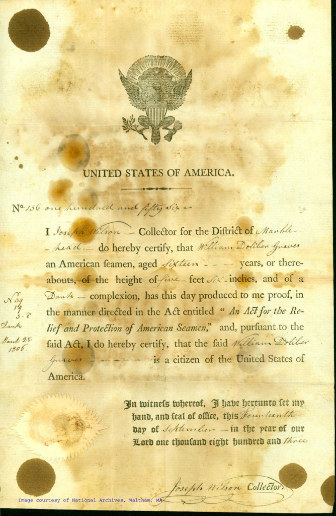 From the Early national period, directly following the American Revolution, until after the War of 1812, seamen were sometimes “impressed,” or kidnapped, by members of the British or French navy. Many sailors carried papers that would allow them to prove their identity. This 1803 document for a 16 year-old from Marblehead, states that he is a citizen of the U.S.