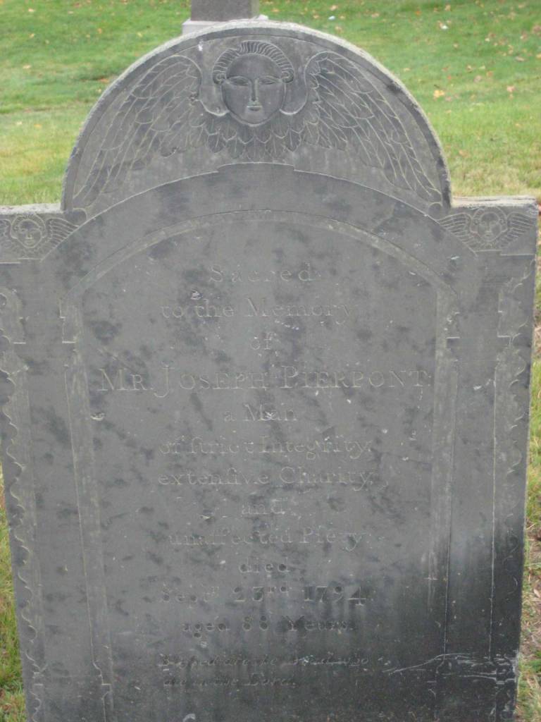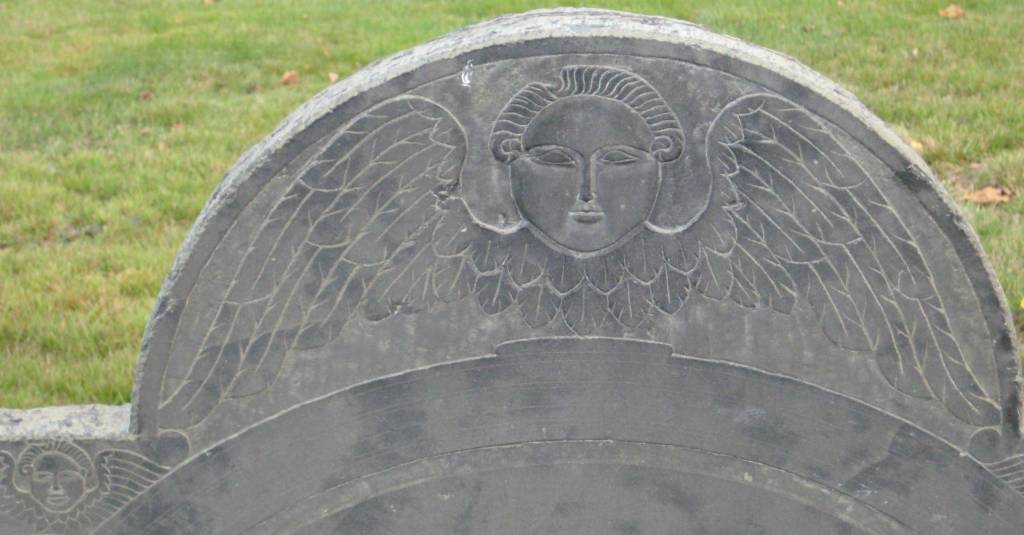 This grave stome displays a winged cherub atop an elaborately carved memorial. As views of death changed and people accepted the idea of souls ascending into heaven, carvings depicting angels became more common. This is one of many found in a graveyard on the border between Salem and Peabody.
