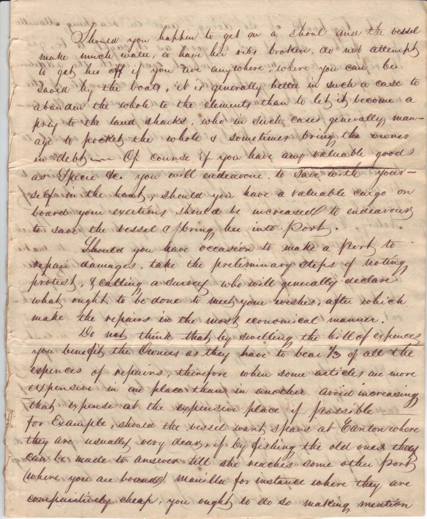 For example, should the vessel want spars at Canton where they are usually ver dear, if by fishing the old ones they can be made to answer till she reaches some other port (where you are bound) Manilla for instance where they are comparatively cheap, you ought to do so making mention