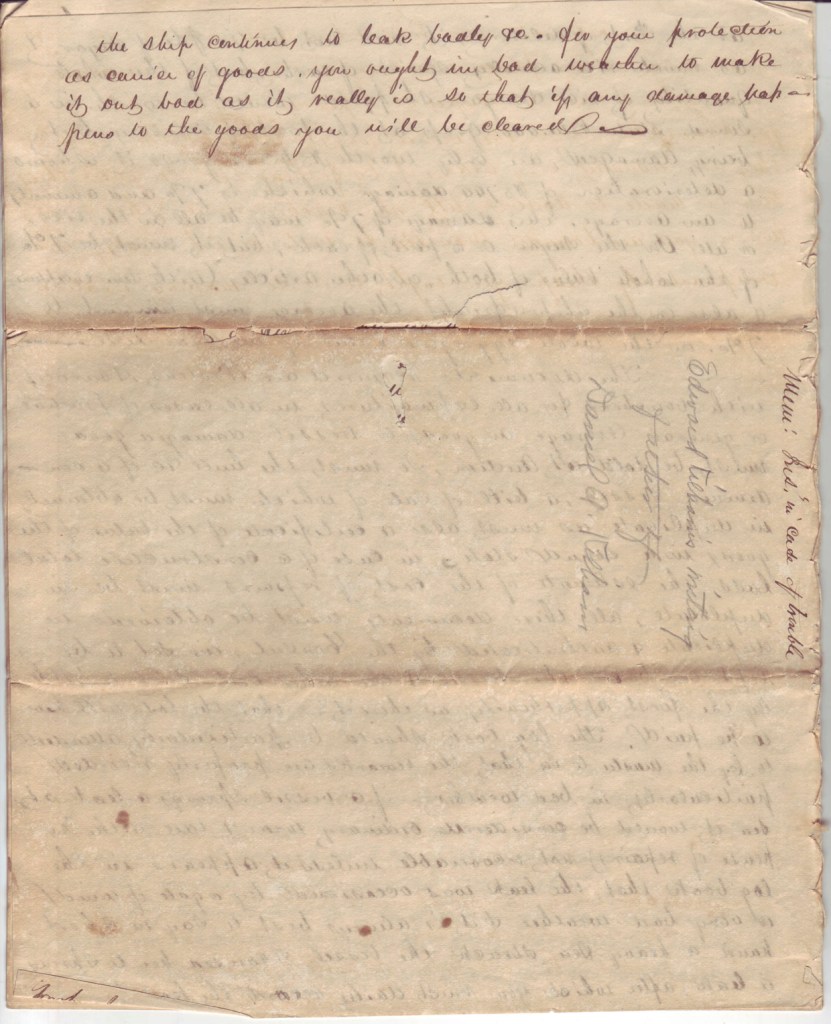 While the document is included in the Kilham collection, there is no indication for whom this document is written. It contains instructions for what to do if you encounter problems with a China Trade ship (getting caught on a shoal, breaking the ship’s “ribs”, etc.) The instructions detail how to protect the cargo, and the interests of the ship’s owners and stakeholders in the voyage