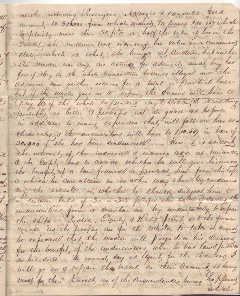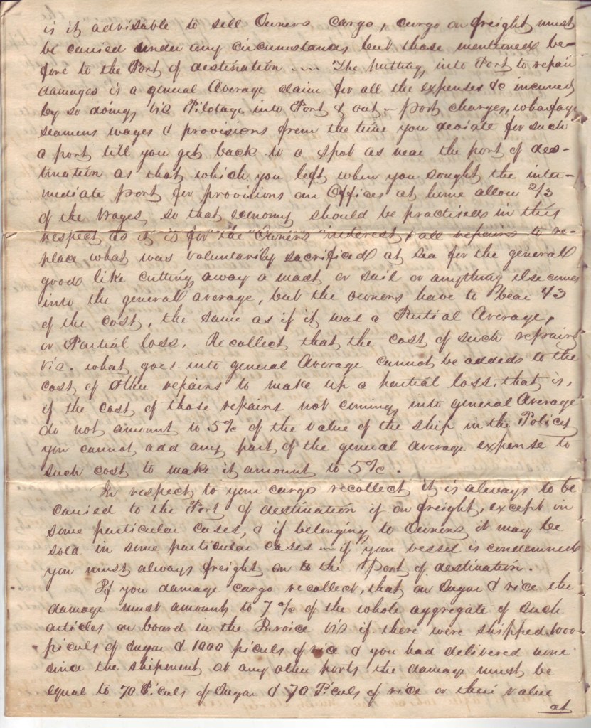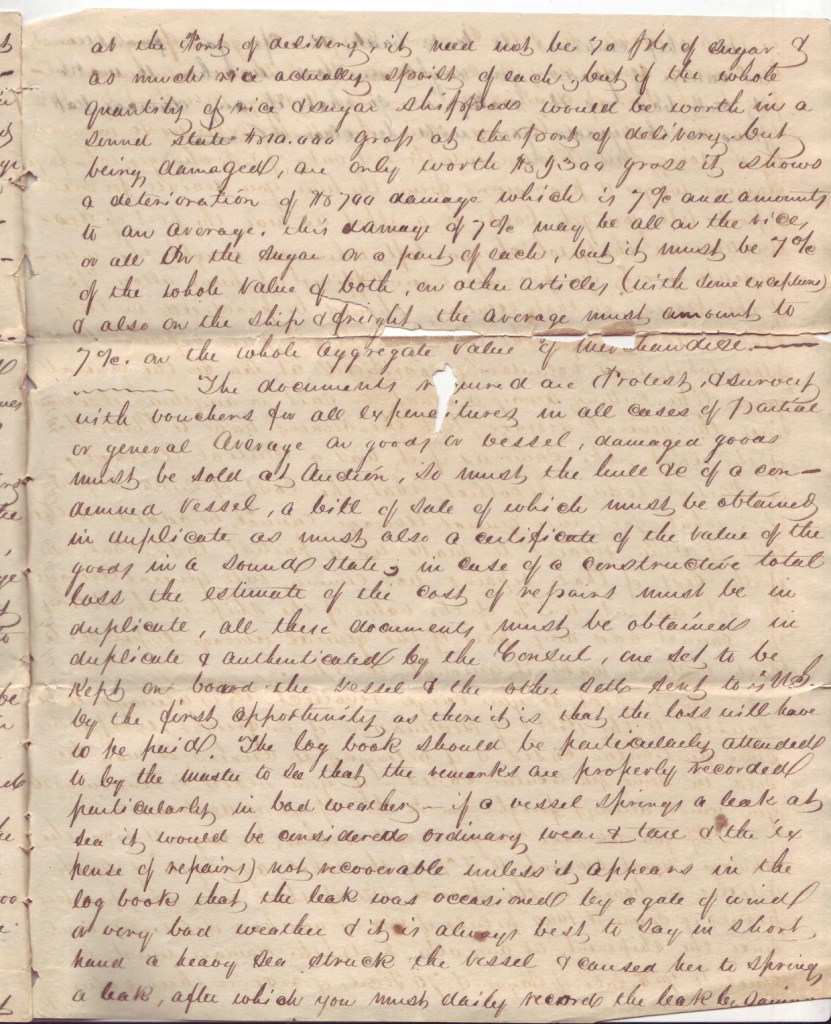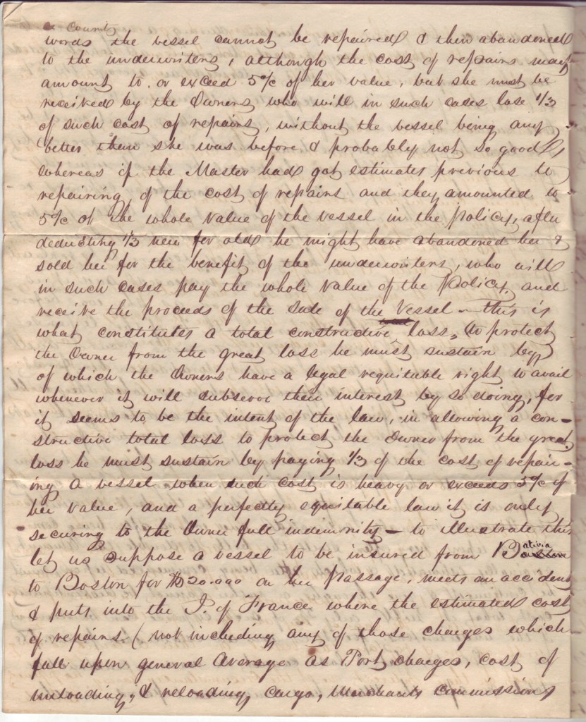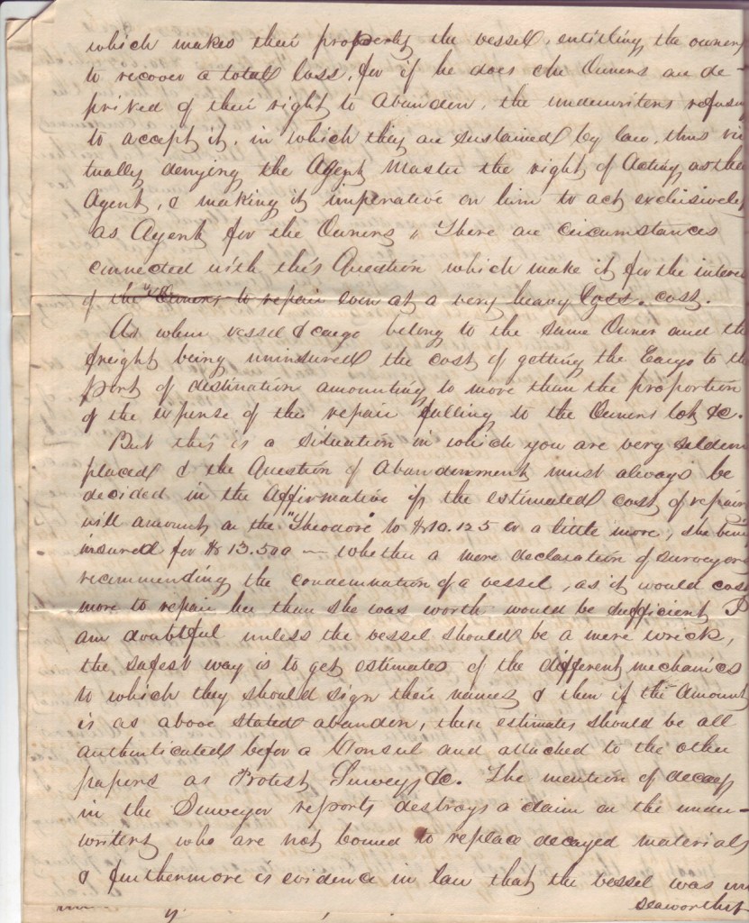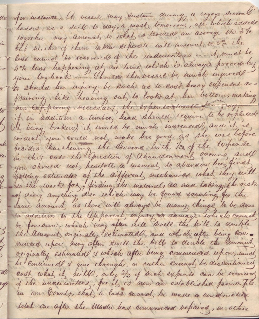 In the log book of so doing, and on reaching Manilla if the fished spar is not so good as it ought to be, get it replaced by a new one, which cost with the additional expense of fishing the old one is recoverable of the underwriting; this case is mentioned merely as illustrative of the principal that no more repairs should be made at an expensive port than will enable a vessel to reach her destined port, or to a port where they can be done cheaper, if the damage sustained and repairs to be made are not serious it will come under the head of partial loss in which case the repairs not including Notary, Consul & Surveyors fees nor any other expense which is not actually for materials to repair the damage, to make an average which is 5% or the value of the policy after deducting 1/3 new for old. Therefore in all cases of repairing he bill should amount to this sum, or a little more without regards to exercising that nice economy if the repairs will evidentally exceed that amount (?) the (?) economy by substituting 2ndhand materials or defer replacing them as above mentioned, but all the repairs necessary to make her safe & seaworthy should in every case be done. Of this the master is reckoned the only competent judge although it will be best to be borne out by the report of the Surveyors who as is before stated will report what the Master desires. Recollect the Average is not made up by a number of successive losses, or damage but must be the result of one disaster at sea.