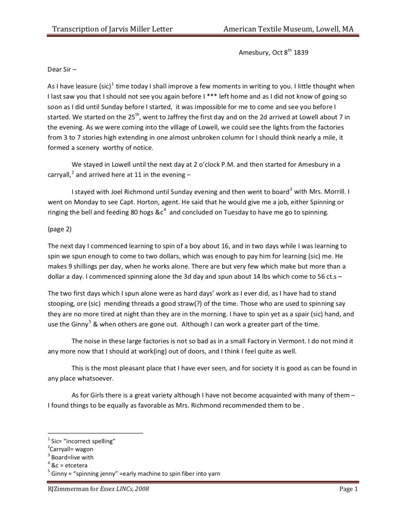 Jarvis Miller, “Jarvis Miller Letter” (October 8, 1839). 2001.74. American Textile Museum, Lowell, MA.