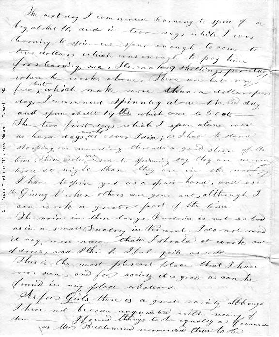 The next day I commenced learning to spin of a boy about 16, and in two days while I was learning to spin we spun enough to come to two dollars, which was enough to pay him for learning (sic) me. He makes 9 shillings per day, when he works alone. There are but very few which make but more than a dollar a day. I commenced spinning alone the 3d day and spun about 14 lbs which come to 56 ct.s –