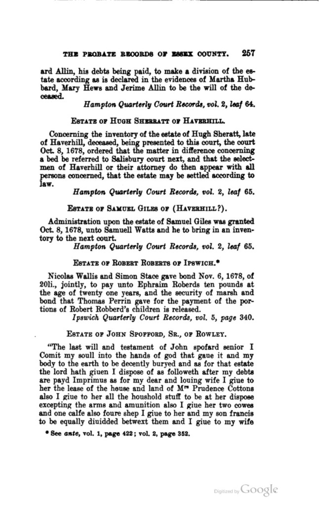 Massachusetts. Probate Court (Essex County). Essex County, Massachusetts Probate Records. Boston: Research Publication Co., 1903.