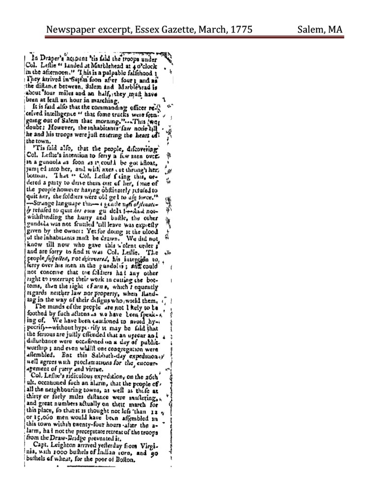 Newspaper excerpt, Essex Gazette (March 1775). America’s Historical Newspapers. Courtesy of Boston Public Library.
