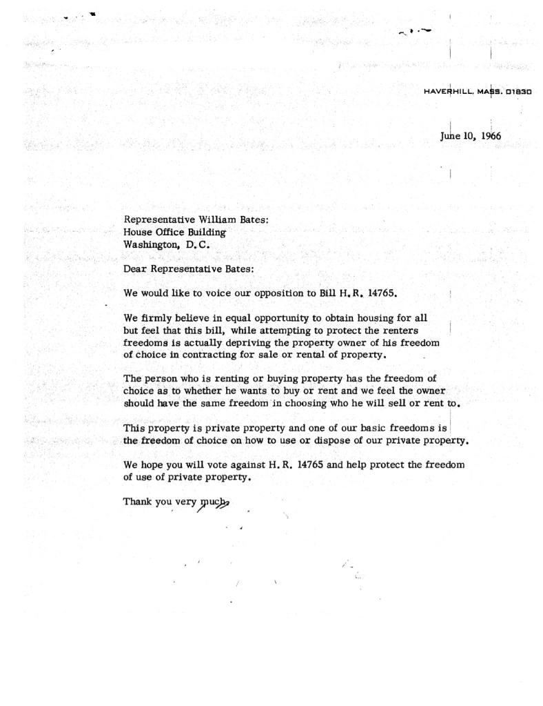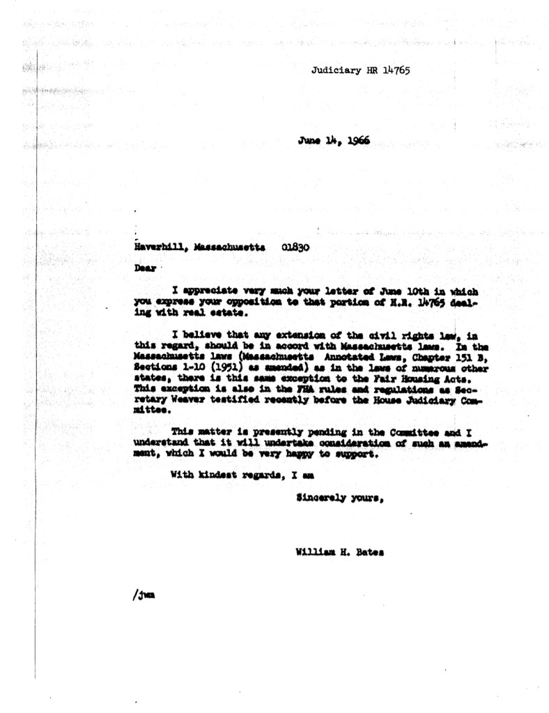 Letter to Congressman Bates, June 10, 1966. William Henry Bates Papers, 1941-1973. North Shore Political Archives 98-02, Folder: “Legislative Files-Judiciary-Civil Rights Act (1966) Box 3-4. Salem State College Archives.