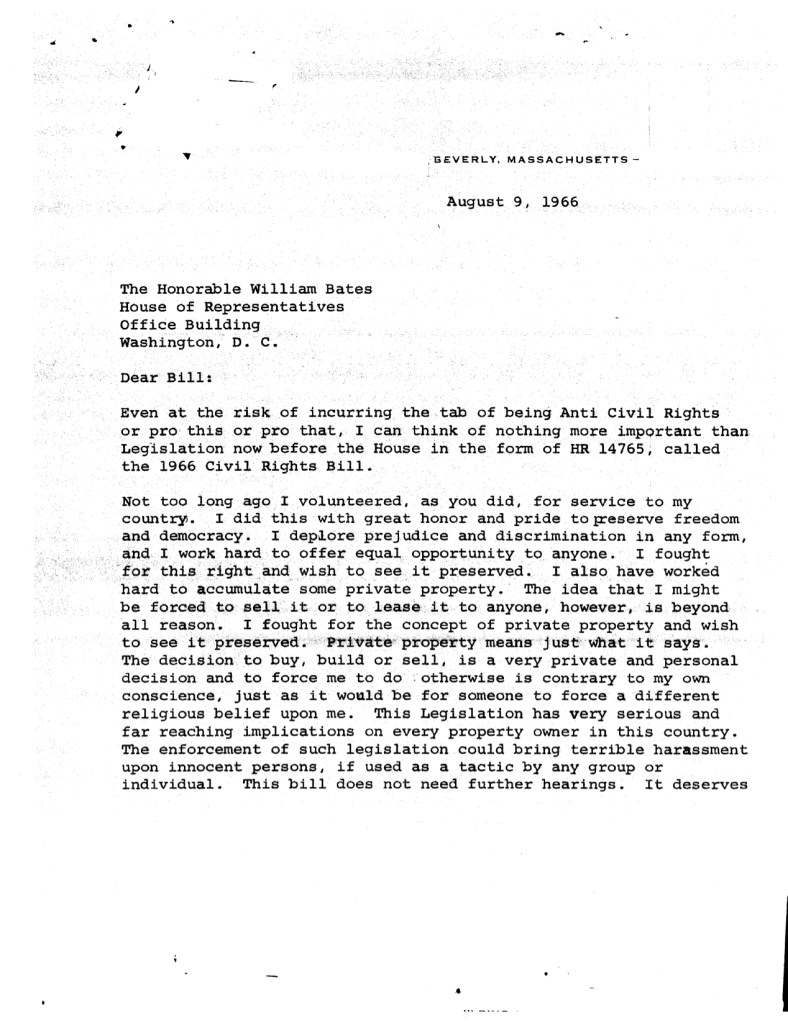 Letter to Congressman Bates, August 9, 1966. William Henry Bates Papers, 1941-1973. North Shore Political Archives 98-02, Folder: “Legislative Files-Judiciary-Civil Rights Act (1966) Box 3-4. Salem State College Archives.