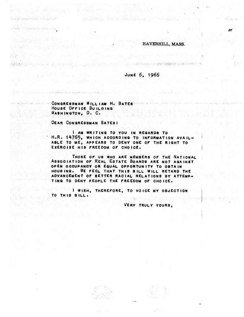 Letter to Congressman Bates, June 6, 1966. William Henry Bates Papers, 1941-1973. North Shore Political Archives 98-02, Folder: “Legislative Files-Judiciary-Civil Rights Act (1966) Box 3-4. Salem State College Archives.