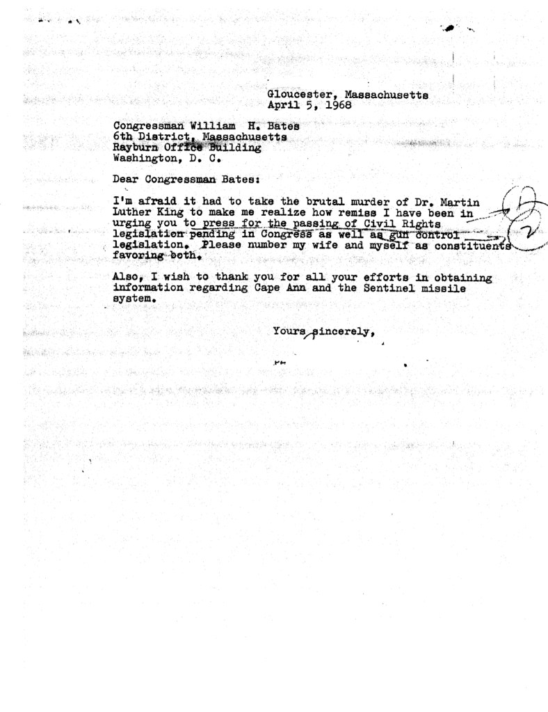 A resident of Gloucester wrote this letter to Congressman Bates in 1968. It comments on the assassination of Dr. Martin Luther King, Jr., which had occurred the previous day.