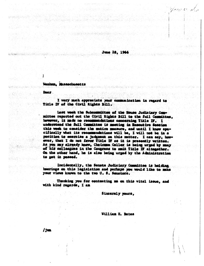 Letter to Congressman Bates, June 24, 1966. William Henry Bates Papers, 1941-1973. North Shore Political Archives 98-02, Folder: “Legislative Files-Judiciary-Civil Rights Act (1966) Box 3-4. Salem State College Archives.