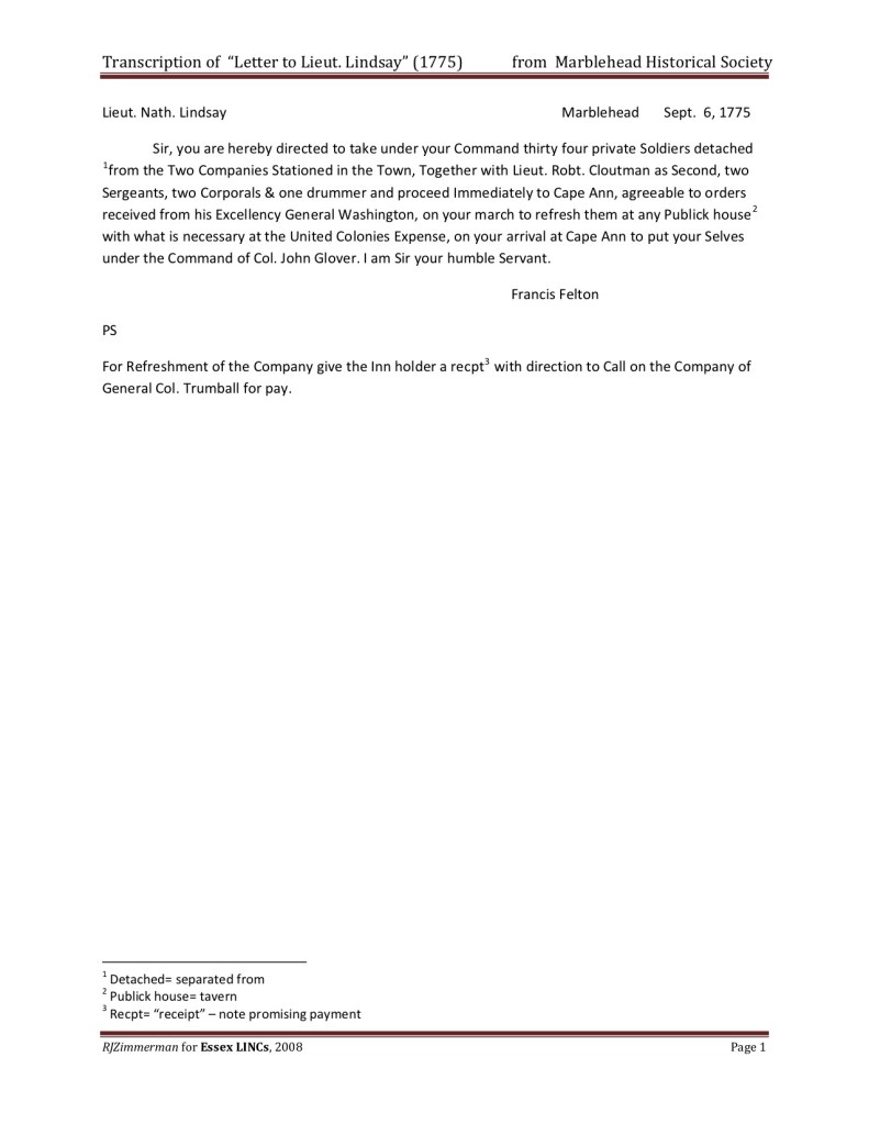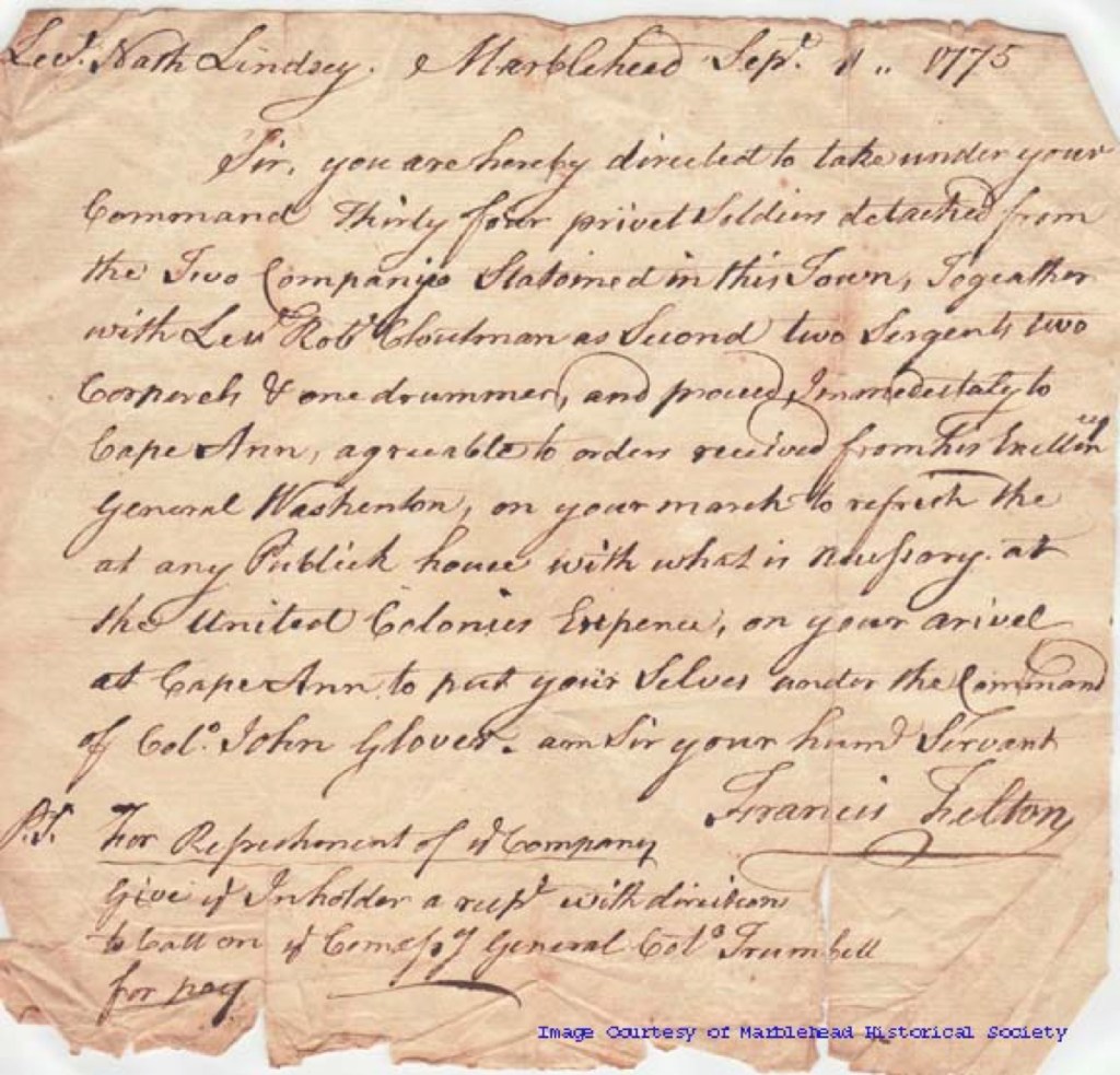 This letter to Lieutenant Nath. Lindsay, under orders from Washington, directs him to take his company of Marblehead soldiers to Cape Ann under the command of John Glover.