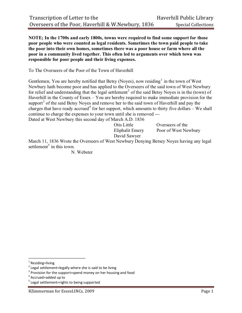 Letter to the Overseers of the Poor, Haverhill and West Newbury, (1836). The Haverhill Public Library, Special Collections, Haverhill, MA.