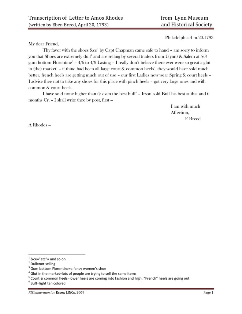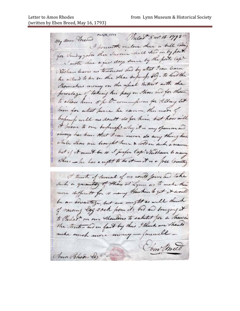 Eben Breed, Letter to Amos Rhodes (May 16, 1793 and April 20, 1793). Lynn Museum and Historical Society, Lynn, MA.