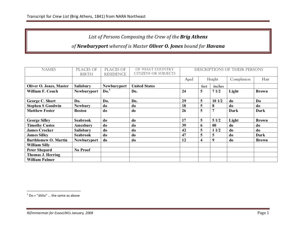 In 1841, the Brig, Athens, sailed to Havana from Newburyport. On board were men ranging in age from 12 to 47. Natives of Newburyport, Newbury, Salisbury, Amesbury, Seabrook, and Boston were included on this voyage. The document gives statistical data about their ages and physical characteristics as well.