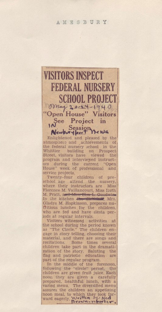Ned Brown, “VISITORS INSPECT FEDERAL NURSERY SCHOOL PROJECT,” Newburyport News (Newburyport, MA), May 20-24, 1940. National Archives and Records Administration, Waltham, MA.