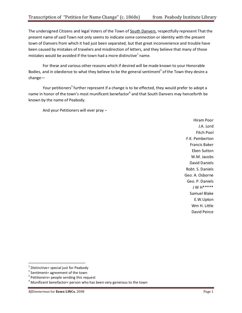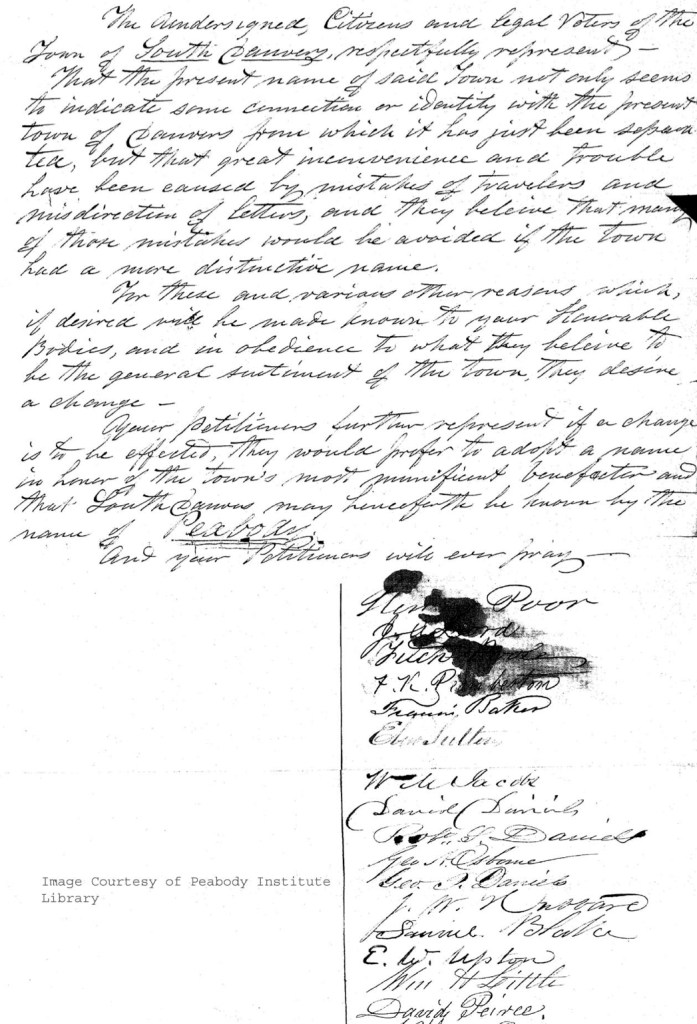 Your petitioners3 further represent if a change is to be effected, they would prefer to adopt a name in honor of the town’s most munificent benefactor4 and that South Danvers may henceforth be known by the name of Peabody.