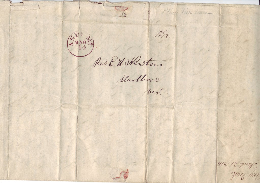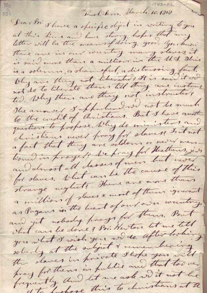 Pliny Fisk, “Letter concerning prayers for slaves and religion in Andover, Letter to Rev. Ephraim H. Newton” (March 10, 1818). Ms s 551. Andover Center for History and Culture, Andover, MA.