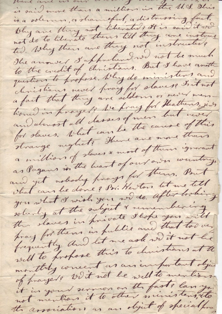 The answer I apprehend would not be much to the credit of Christians. But I have another question to propose. Why do ministers and christians never pray for slaves? Is it not a fact that they are seldom or never mentioned in prayer? We pray for Heathens, jews and almost all classes of men but never for slaves. What can be the cause of this strange neglect? There are more than a million of slaves & most of them ignorant as Pagans in the heart of our own country, and yet nobody prays for them. But what can be done? Br. Newton let me tell you what & I wish you would do after looking soberly at the subject & remembering the slaves in private I hope you will pray for them in public and that too very frequently. And let me ask would it not be well to propose this to christians at a monthly [concert?] as an important object of prayer? Would it not be well to mention it in your sermon on the fast? Can you not mention it to other ministers, & to the association as an object of special prayer[?]