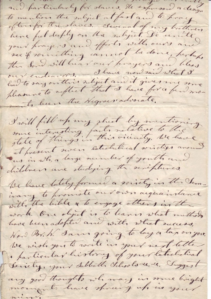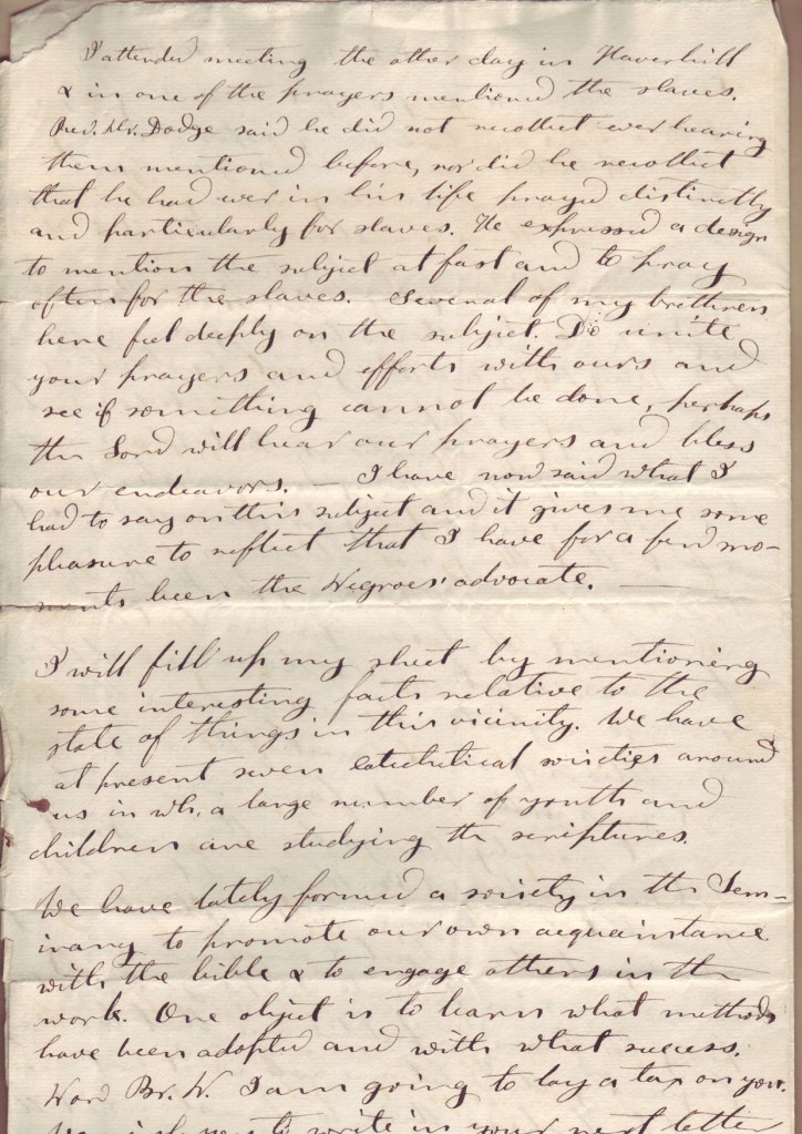 I attended meeting the other day in Haverhill & in one of the prayers mentioned the slaves. Rev. [???] Dodge said he did not recollect ever hearing them mentioned before, nor did he recollect that he had ever in his life prayed distinctly and particularly for slaves. He expressed a design to mention the subject at fast and to pray often for the slaves. Several of my brethren here feel deeply on the subject. Do unite your prayers and efforts with ours and see if something cannot be done, perhaps the S??d will hear our prayers and bless our endeavors. – I have now said what I had to say on this subject and it gives me some pleasure to reflect that I have for a few moments been the Negroes’ advocate. –