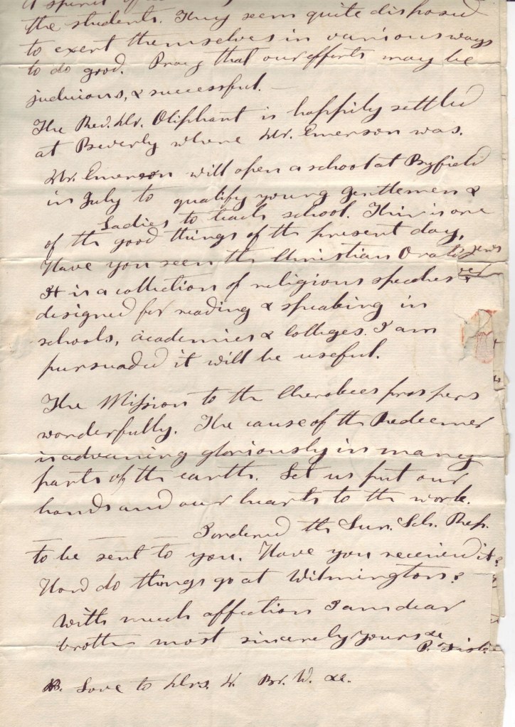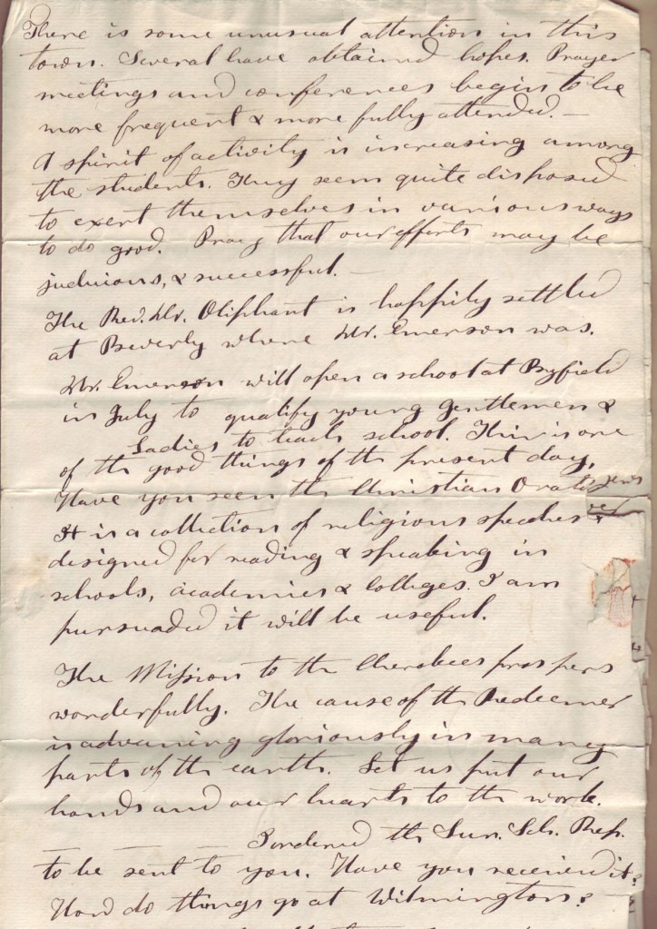 HW. Emerson will open a school at Byfield in July to qualify young gentlemen & Ladies to teach school. This is one of the good things of the present day. Have you seen the Christians [orat???] It is a collection of religious speeches designed for reading & speaking in schools, academies & colleges. I am [persuaded] it will be useful.