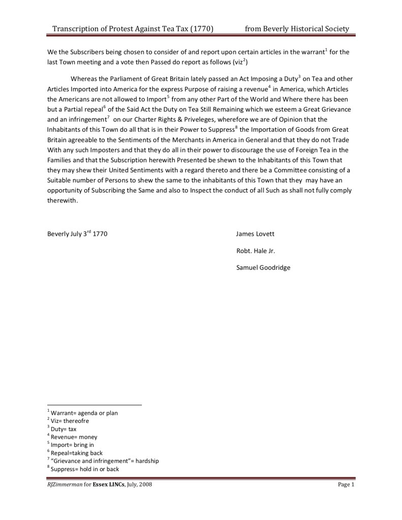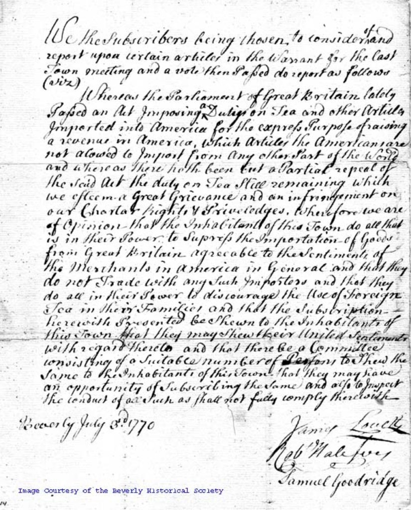 In 1770 citizens of Beverly issued a report after the town meeting which expressed their distress at the taxes on tea from foreign ports. Coastal towns were directly affected, as their businesses were tied up in trade with many nations. It is unclear as to whom this protest is addressed, but it stresses that the town is complying with the tax laws, but finds it a hardship.