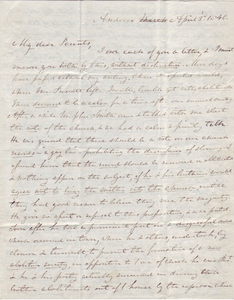 I owe each of you a letter, & I must answer you both, by this, without distinction. More days have passed without my writing, than I expected would, when Mr. Prescott left. Trouble, trouble yet with abolitionists. There seemed to be a calm for a time after our annual meeting. After a while Mr. John Smith came & talked with me about the vote of the church, & we had a calm and friendly talk. He was grieved that there should be a vote on our church records – “a gag law” – prohibiting the discussion of slavery. I assured him that the record would be removed or obliterated & nothing appear on the subject, if he & his brethren would agree not to bring the matter into the church, until they had good reason to believe they were the majority. He gave no assent or refusal to this proposition, and so we parted. Soon after he bore a prominent part in a disgr[a]ceful scene which occurred in town, when he & others, undertook, by clamor and tumult, to prevent the formation of a new abolition society, in opposition to [the] one of which he was Prest. & he and his party actually succeeded in driving their brother abolitionists out of [the] house by the uproar which was occasioned. I was present as a spectator only, but he was probably mortified that I was a witness of the scene, as he was no doubt ashamed of his conduct afterwards. The next I heard of him, he declined acting as Treasurer of the Parish any longer: soon after he “signed off,” as it is called here, refusing to be taxed here. I understand he intends to worship with us for the present. He gave me no intimation of any such design, as leaving us. The whole reason is that his abolition measures are not favoured by [the] church & minister. No others have gone as yet. If they can’t be peaceable, we choose to have them go. We have shown every indulgence consistent with our consciences. What [the] end is to be, we don’t yet know. Mr. Smith & his wife are exceedingly unhappy. I pity them. There is no other church where they can go & be any better off, than in mine. He has laid himself open to discipline, by a violation of pledges – refusing to pay subscriptions on abolition grounds solely; and is now in a fair way to violate his covenant. I am soon to have a full and christian talk with him; & I intend to lay the whole matter before our association for advice, & obtain it from those professors.
