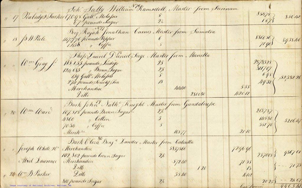 This page shows ships coming from Surinam, Manilla, Guadaloupe, Calcutta, and Sumatra. (Note the amount of pepper coming in from Sumatra. Salem was a leading exporter of pepper at that time) These ships carried a large variety of merchandize : molasses, sugar, pepper, coffee, indigo (a blue dyestuff), tea, and cotton.