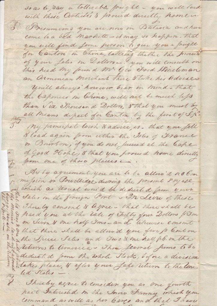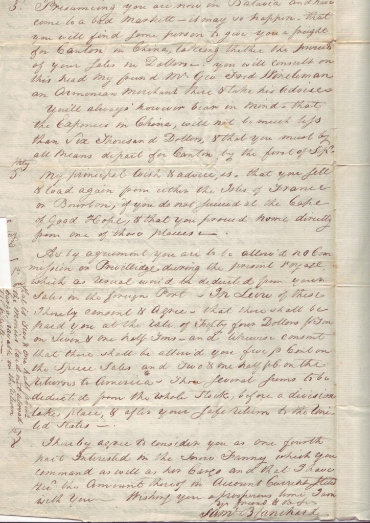 5thly: Presuming you are now in Batavia and have come to a bad market—it may so happen that you will find some person to give you a freight for Canton in China, taking thither the proceeds of your sales in Dollars, you will consult on this (?) my friend Mr. Geo[rge] Fred[Erick] Winetman(?), an Armenian Merchant there & take his Advise.