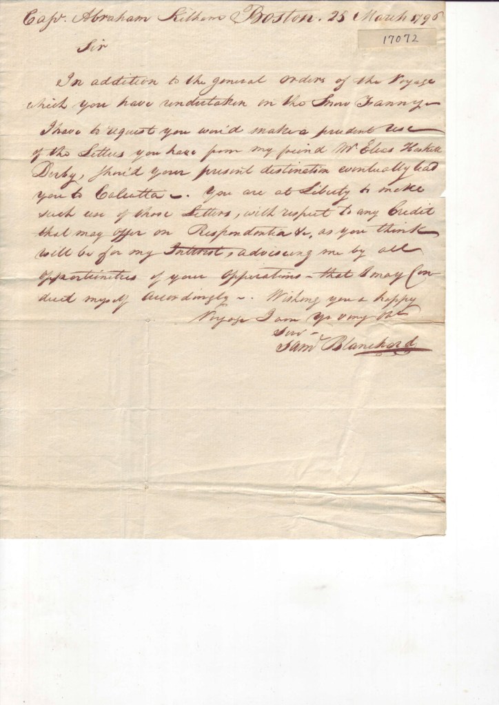 Abraham Kilham was a ship captain from Beverly. It appears that Capt. Abraham Kilham had letters of credit from Elias Derby that he could use on Samuel Blanchard’s behalf to purchase goods in Calcutta that could be sold in Essex County.