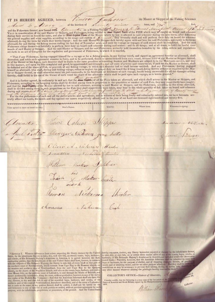 and the Fishermen thereof, now bound from Gloucester on a Fishing Voyage or Voyages of James Mansfield Owner of [?]. That in consideration of the said Master or Skipper, and Fisherman, being entitled to Five Eighths Parts of the FISH which may be caught on board said schooner during their service on board the same, and also to Five Eighths Parts of the MONEY which by law is allowed to said schooner during the same term, after deducting the general supplies and other supplies, according to the usage and custom of Gloucester they severally shall and will perform their duty on board the schooner aforesaid, during the term for which they herein engage: And the said Master or Skipper doth hereby agree with and hire the said Fishermen, agreeably to the terms aforesaid, for and during the fishing season ending the last day of November next, and until the voyage or voyages of said season shall be completed. And the said Fishermen oblige themselves faithfully to perform their duty on board said schooner during said season: and in all things, and at all times, to fulfil the lawful commands of said Master or Skipper. And the said master or Skipper, and the said Fishermen, mutually hold themselves bounden by the rules, orders and regulations set forth in an act of Congress for their regulation and government of Fishermen, in which it is enacted,
