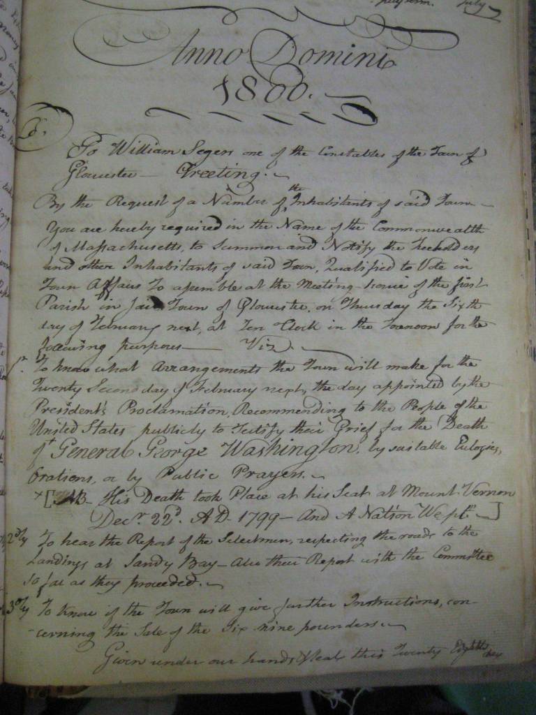 “Town Meeting Warrant – Washington’s Death” (January 1800). City of Gloucester Archives, Gloucester, MA.